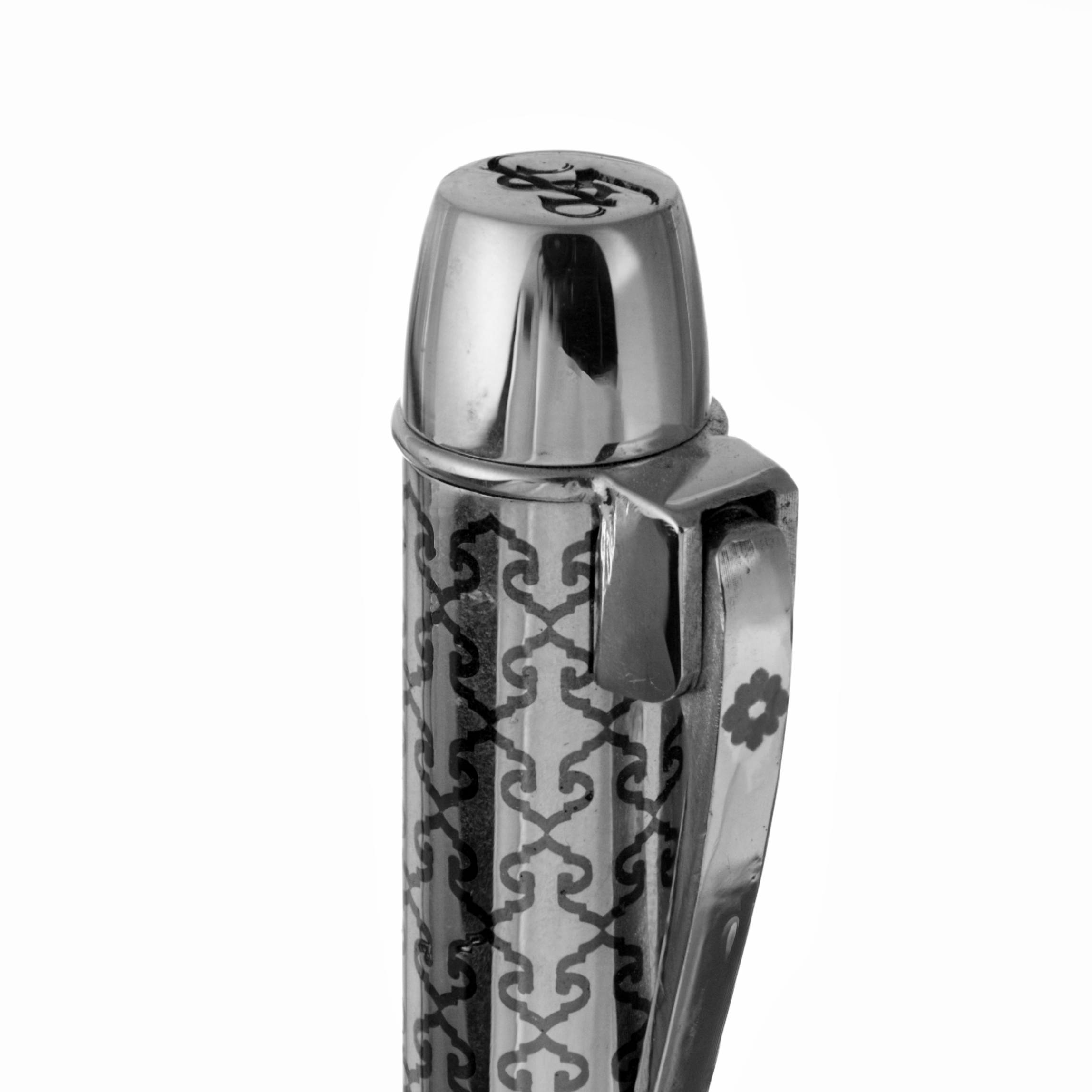 With so many designs, from grand to small in scale, it is difficult to distill ideas into a workable piece. Based upon the number of photos in my design folder, I expect there will be many more pens inspired by this location. The pattern used here is taken from a marble tracery around the base of a column. It is rendered here in Argentium silver with niello inlay. The spring loaded clip features a small niello flower.